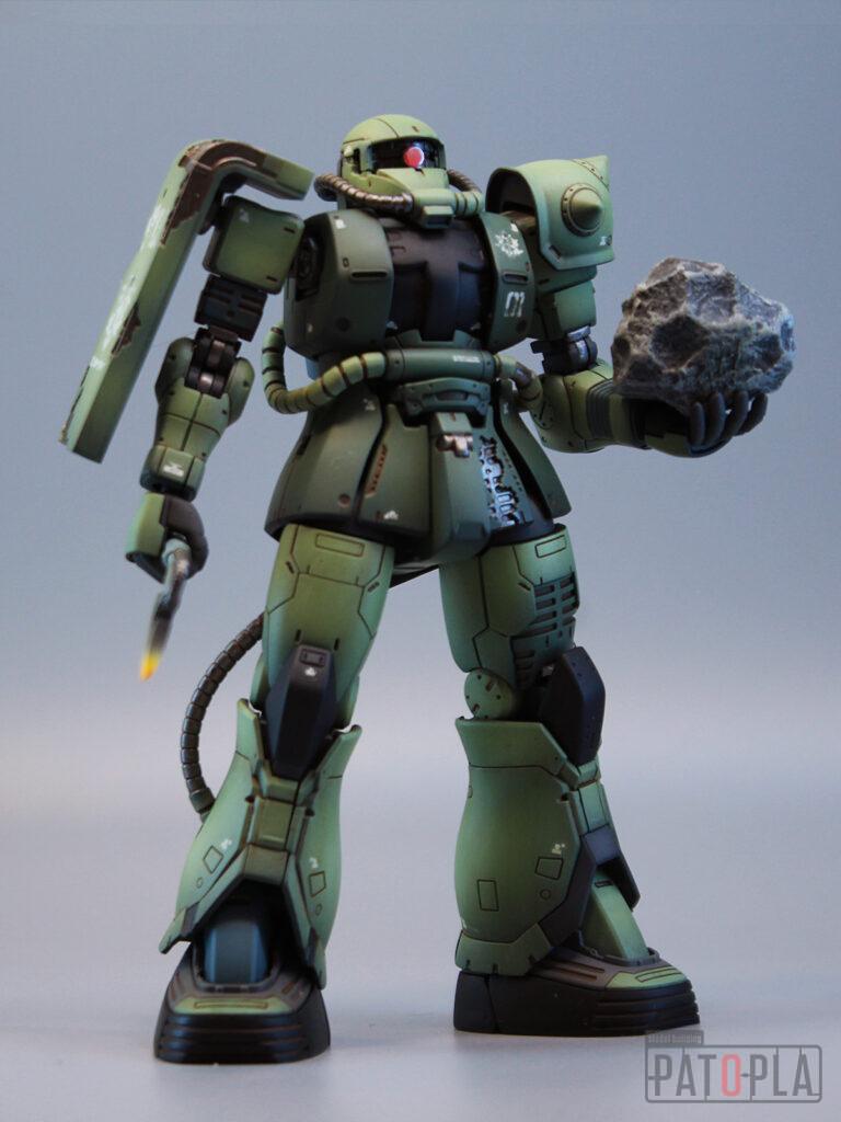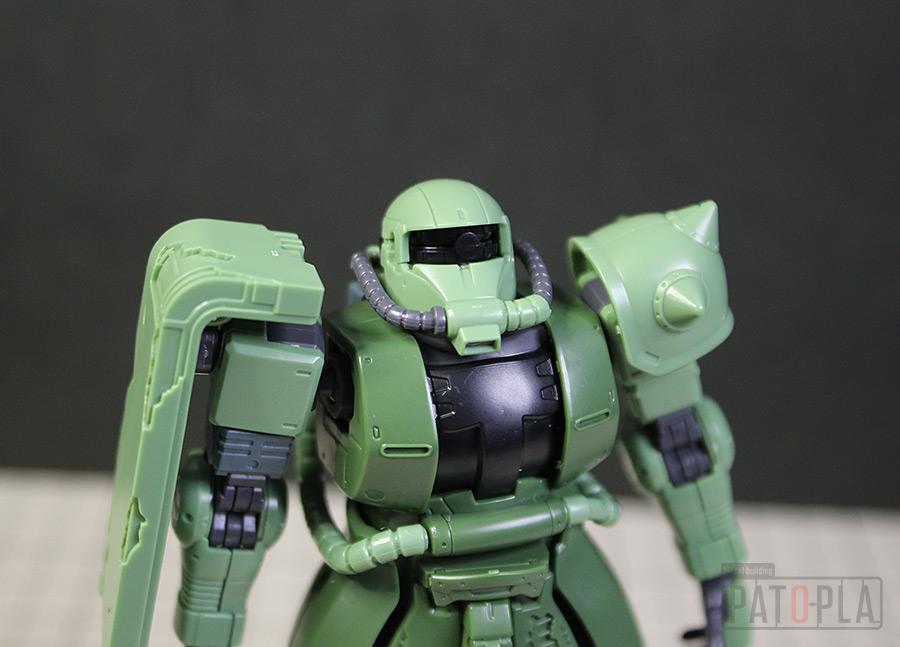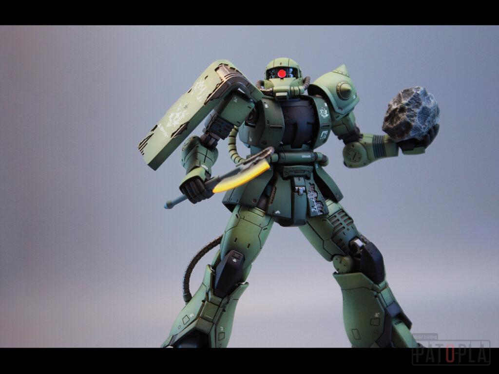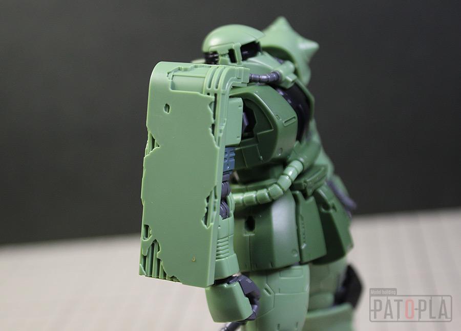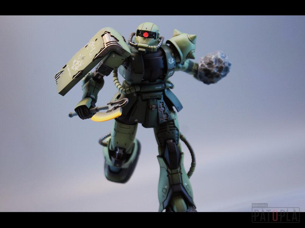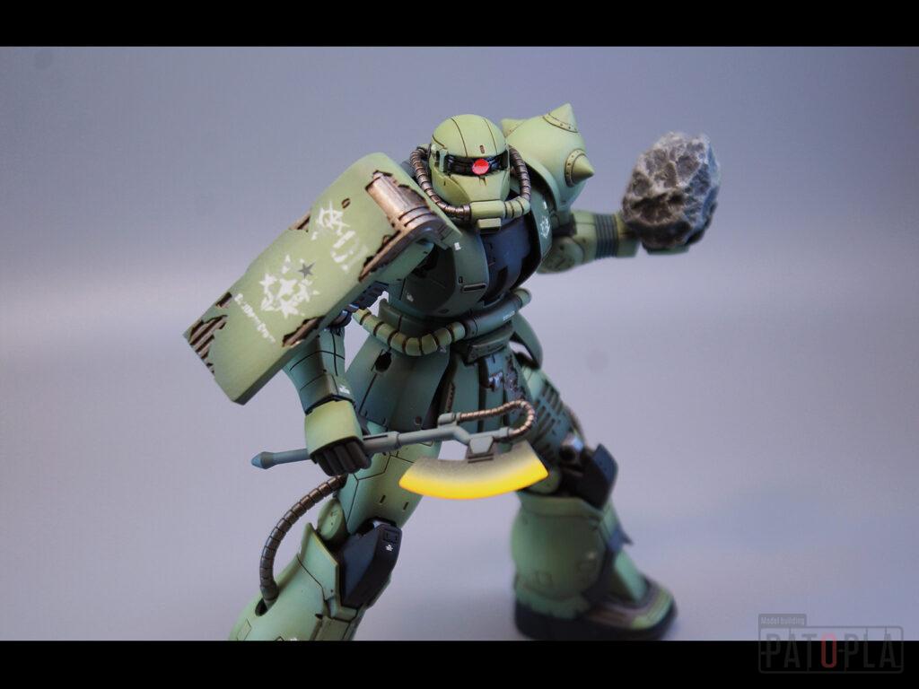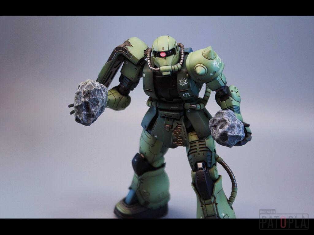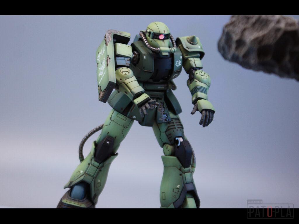 originザクがベースになっており、鼻が伸びたような顔が特徴的ですが、ところどころ装甲が破損してフレームが露出したようなディテールに変更されています。