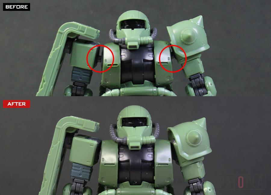 仮組後、こちらは可動域を確保するために設けられていた遊びだということが判りましたが、たしかに玩具感がでますし、プロポーションも悪く見えてしまうので除去することにしました。