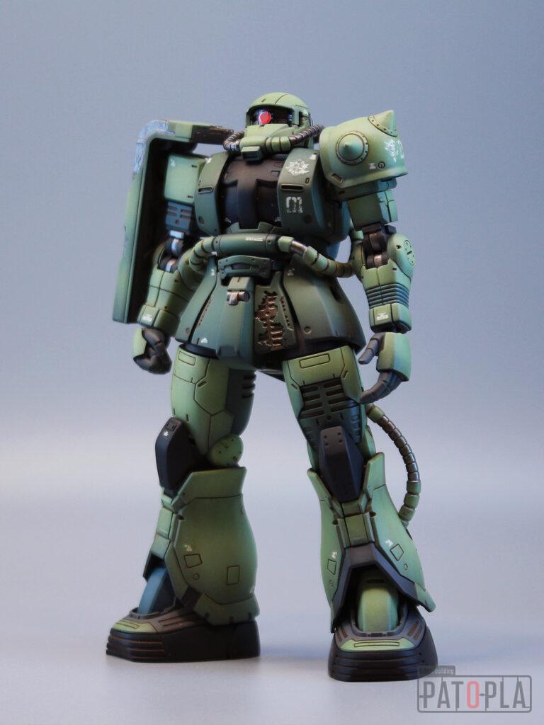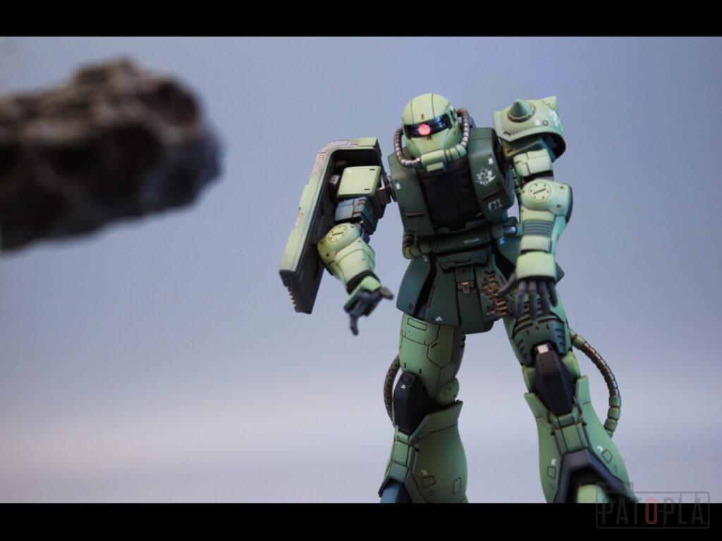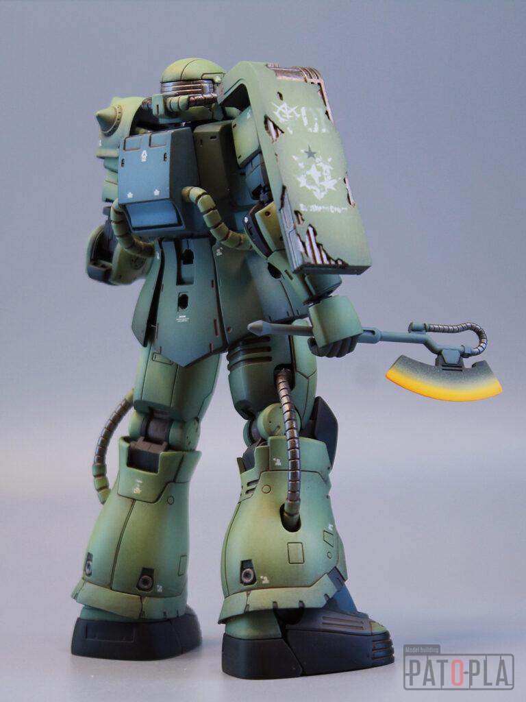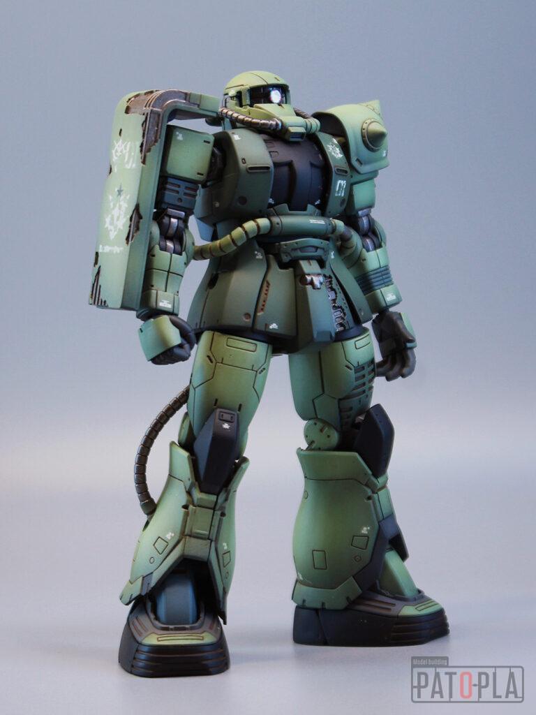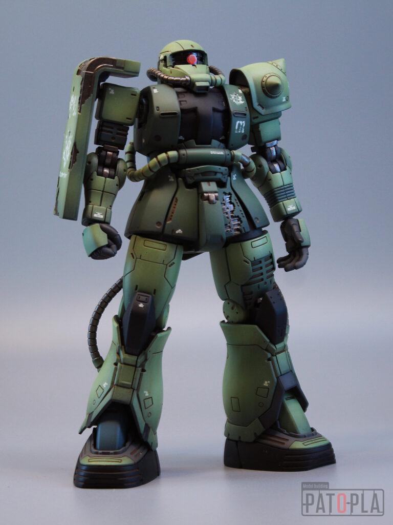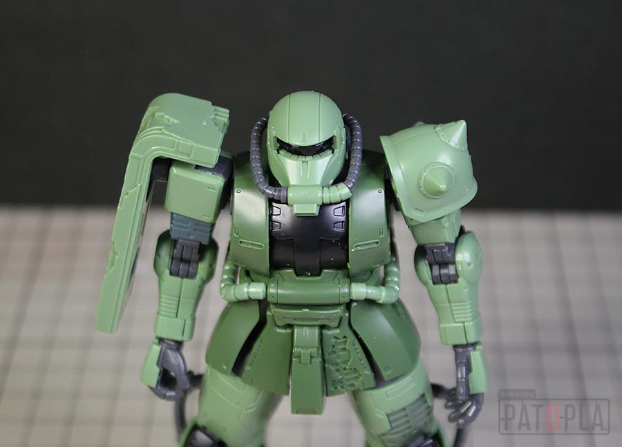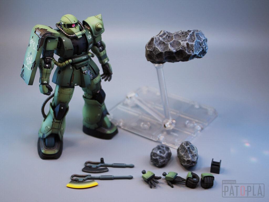 originザクがベースになっており、鼻が伸びたような顔が特徴的ですが、ところどころ装甲が破損してフレームが露出したようなディテールに変更されています。