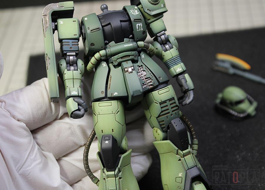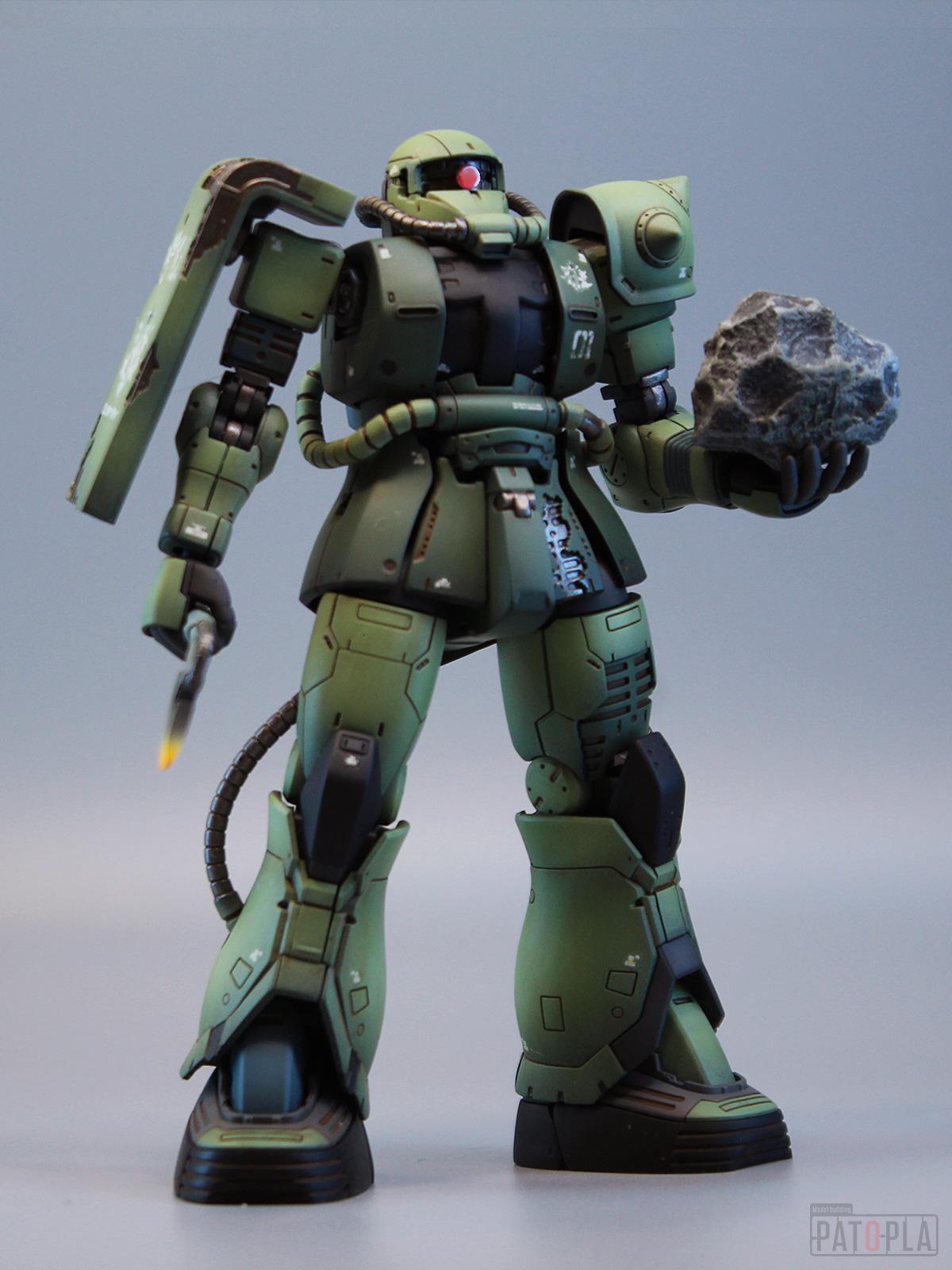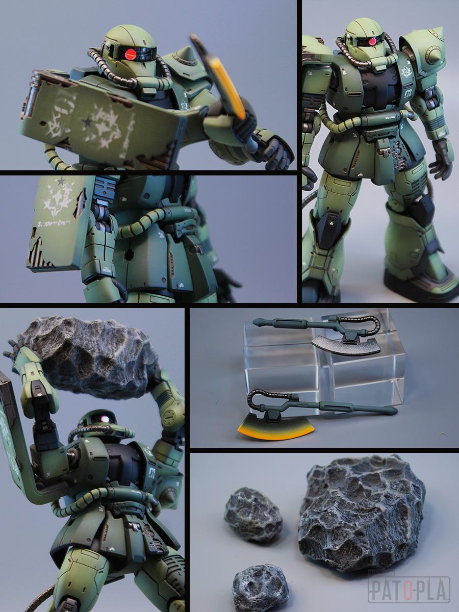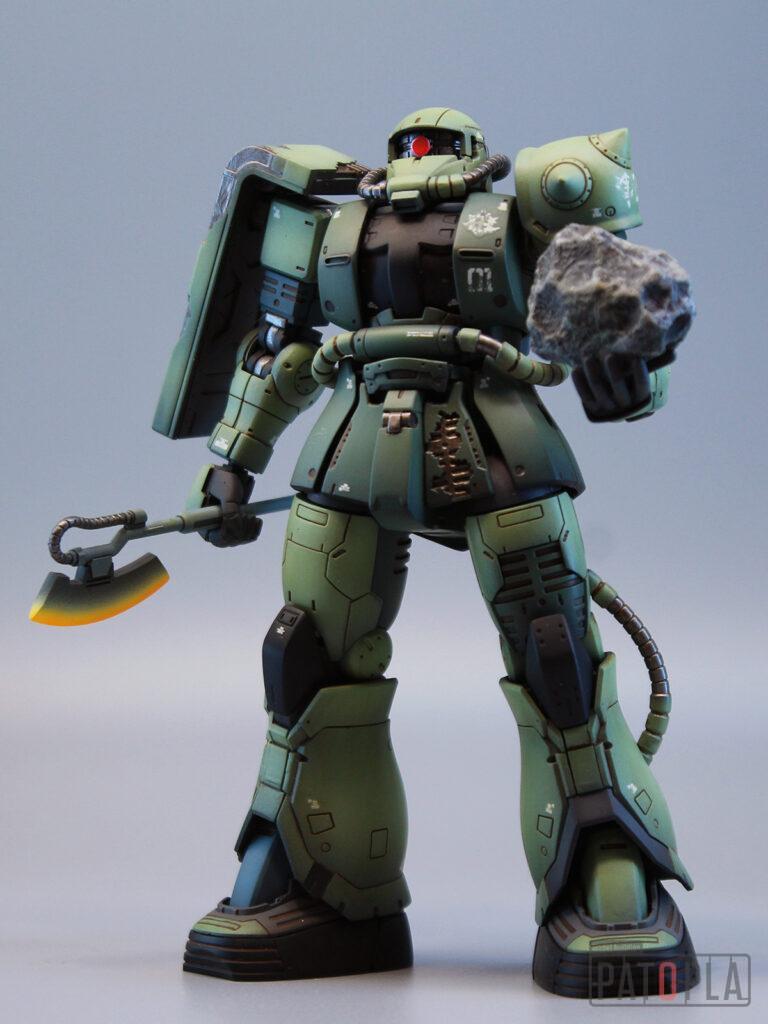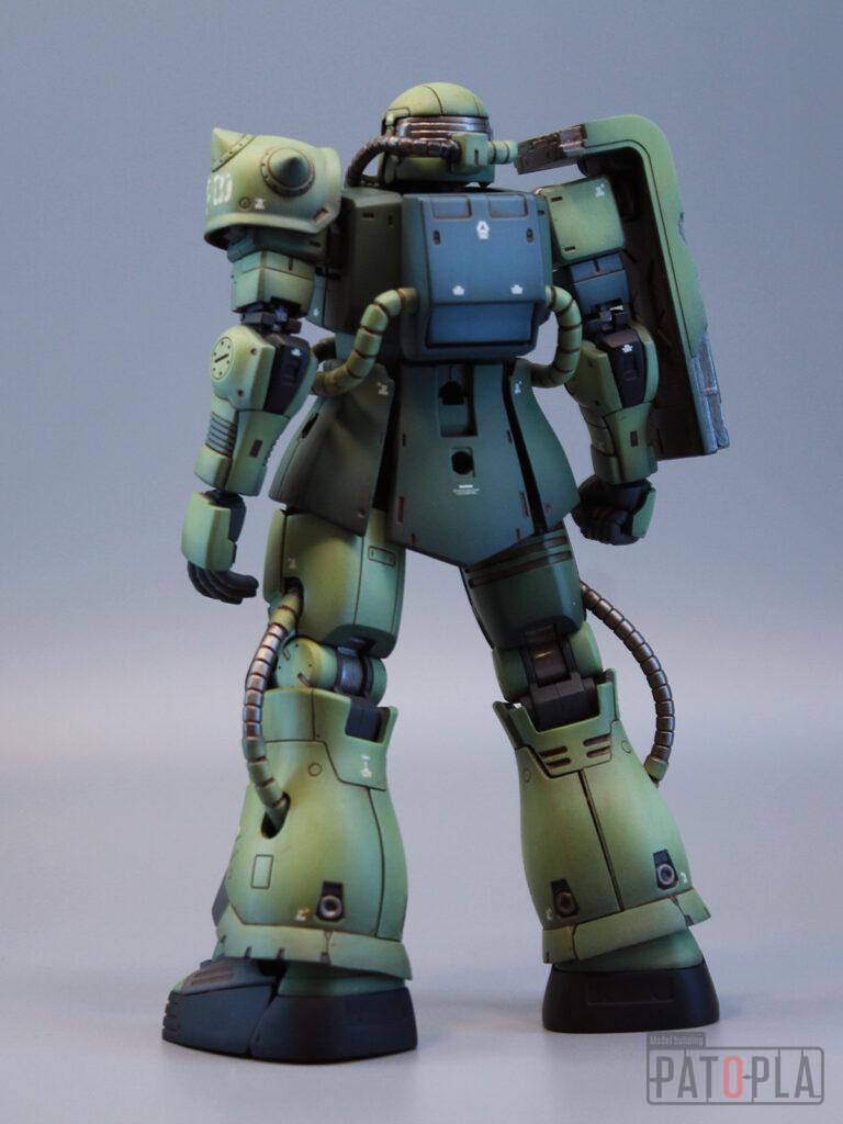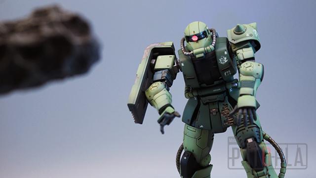 originザクがベースになっており、鼻が伸びたような顔が特徴的ですが、ところどころ装甲が破損してフレームが露出したようなディテールに変更されています。