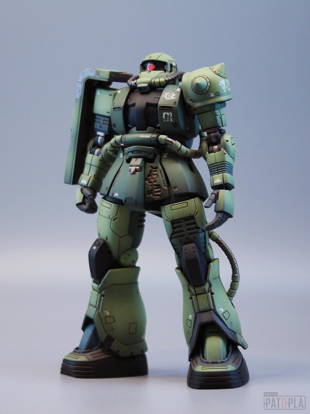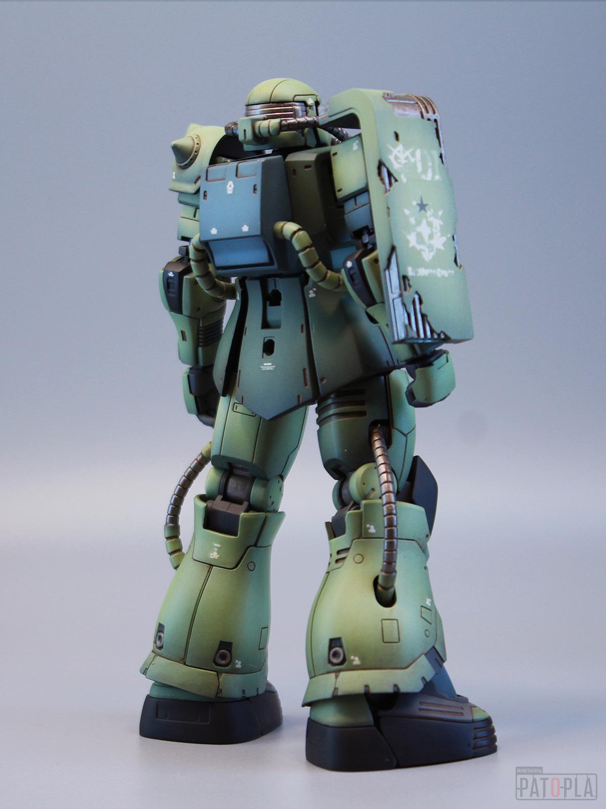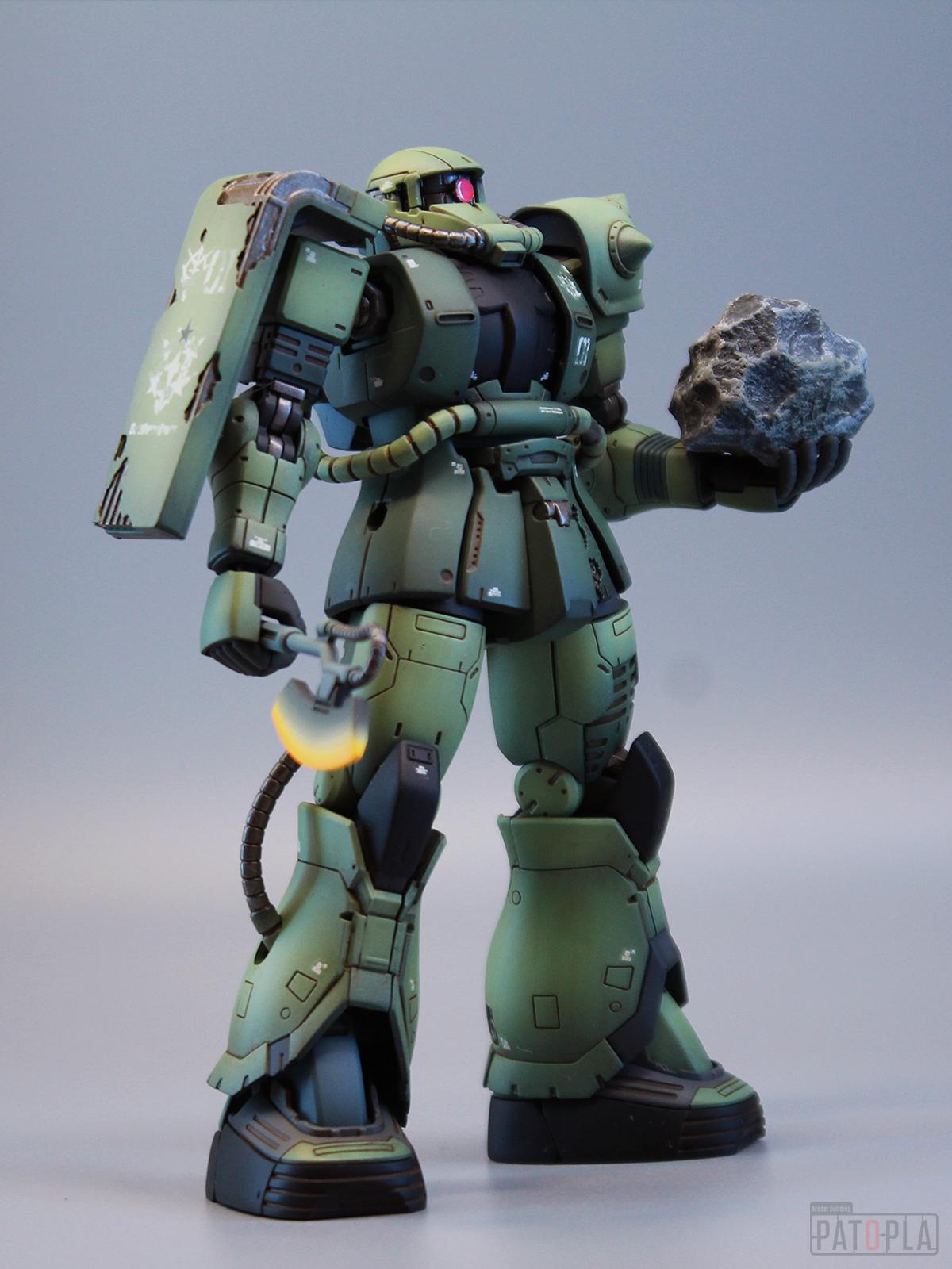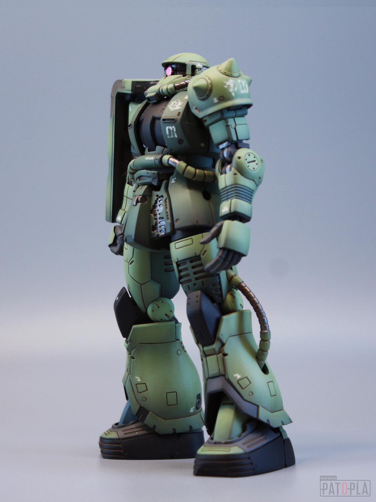 originザクがベースになっており、鼻が伸びたような顔が特徴的ですが、ところどころ装甲が破損してフレームが露出したようなディテールに変更されています。