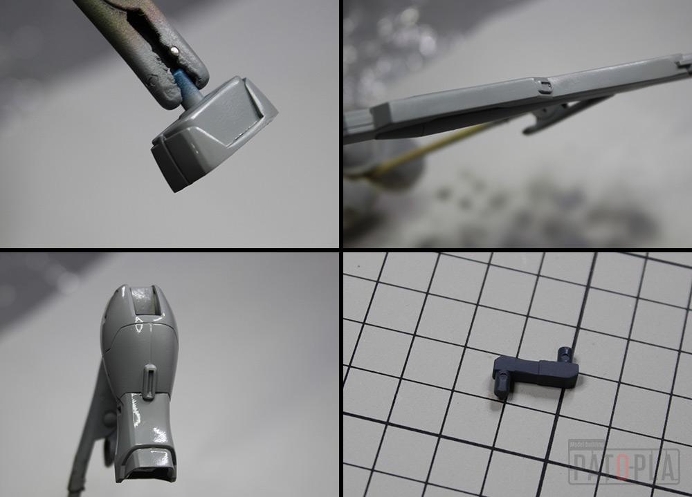 仮組時に気になった武装や前腕、下腿部の合わせ目の除去、リフレクターの肉抜き穴埋め等の表面処理を行いつつ、フェイス部分やスタイル調整を行いました。