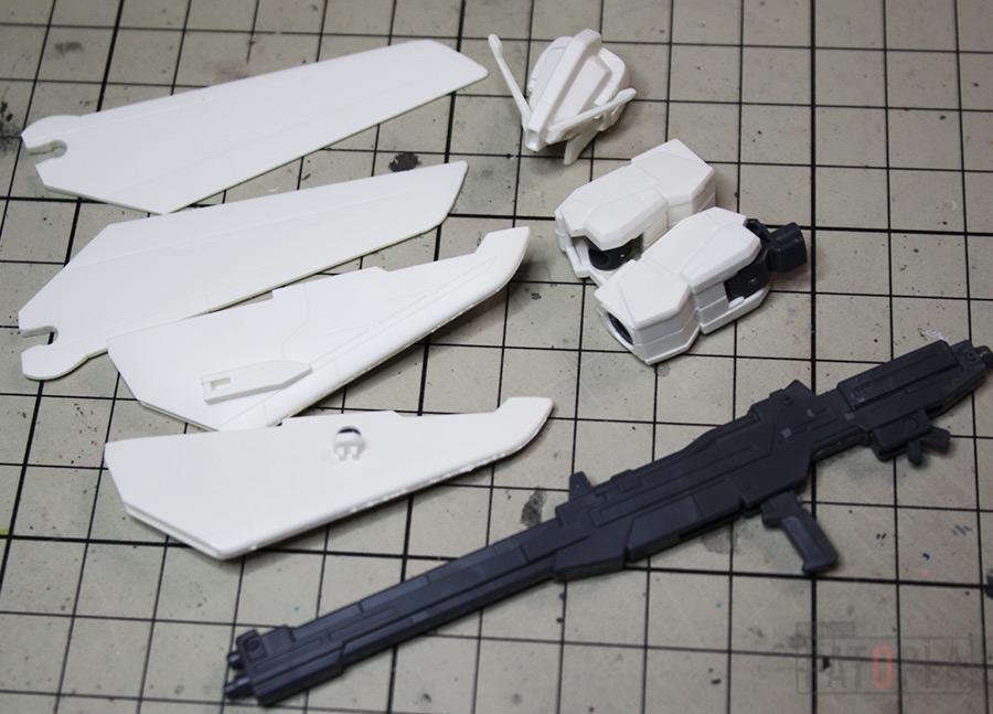 頭部、前腕、主翼、ビームライフルの合わせ目消しを行いました。